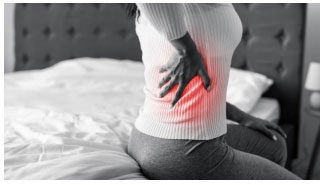 Prostock-studio. (2021). [Photo]. People, Healthcare and Treatment. Closeup of sick young African American woman suffering from acute side back pain, sitting on bed at home, touching area with red highlight. Black And White. https://www.shutterstock.com/image-photo/people-healthcare-treatment-closeup-sick-young-1962299