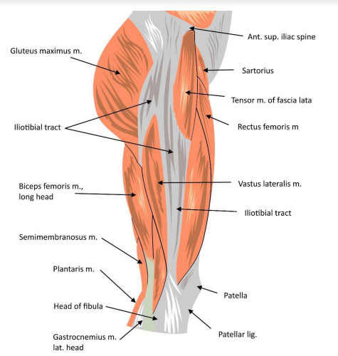 ● The rectus femoris insertion at the anterior inferior iliac spine, the sartorius insertion at the anterior superior, iliac spine, the hamstring insertion at the ischial tuberosity, the tensor fascia lata on the iliac crest, and the rectus abdominis insertion on the superior corner at the pubic symphysis are the main muscles involved in this injury.
